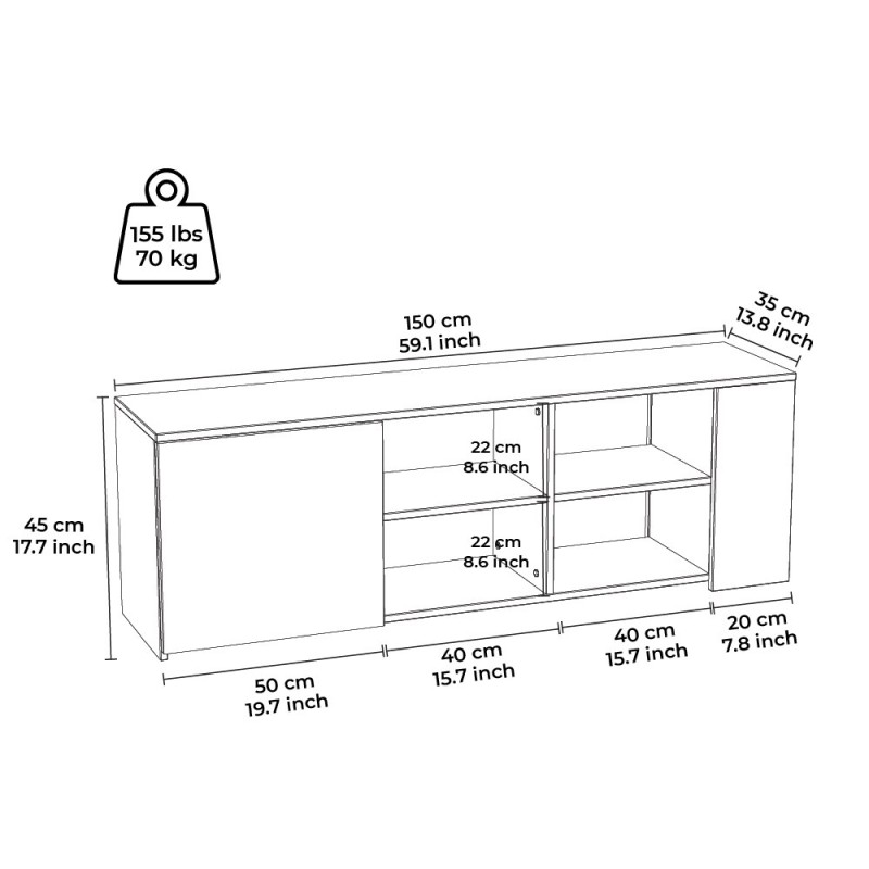 Πλάτος: 150 cm Ύψος: 45 cm βάθος: 35 cm Ύψος ράφι: 22 cm