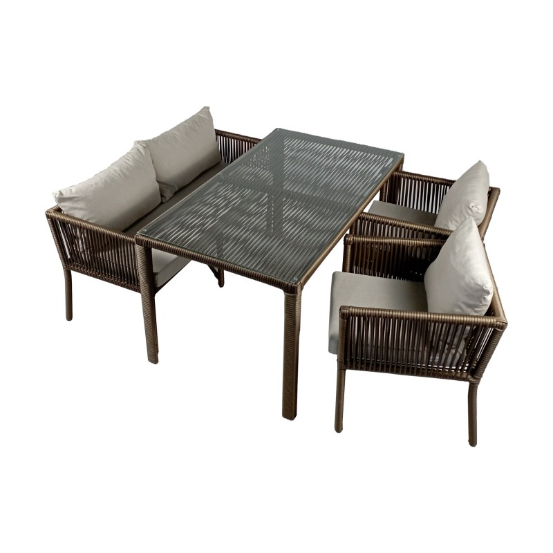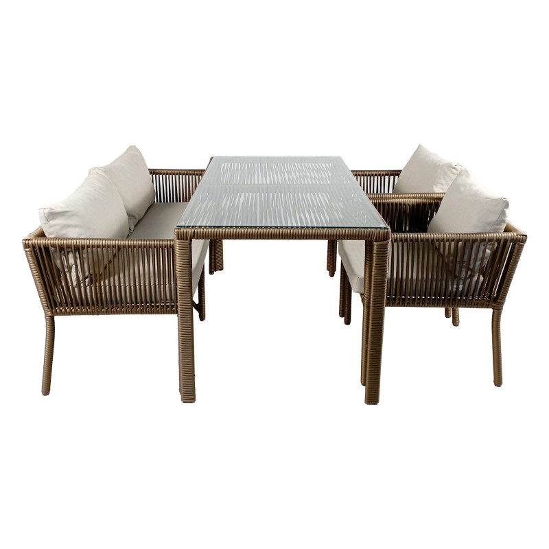 Σκελετός: 100% ΑΛΟΥΜΙΝΙΟ Επιφάνεια τραπεζιού: 100% TEMPERED GLASS Ανθεκτικό σε αμαυρώσεις Μέγεθος τραπεζιού: Πλάτος: 140 cm Ύψος: 75 cm Βάθος: 80 cm (1 Τεμάχιο) Μέγεθος καρέκλας: Πλάτος: 60 cm Ύψος: 70 cm Βάθος: 25 cm Τεμάχια) Μέγεθος καναπέ: Πλάτος: 135 cm Ύψος: 70 cm Βάθος: 61 cm (1 Τεμάχιο)